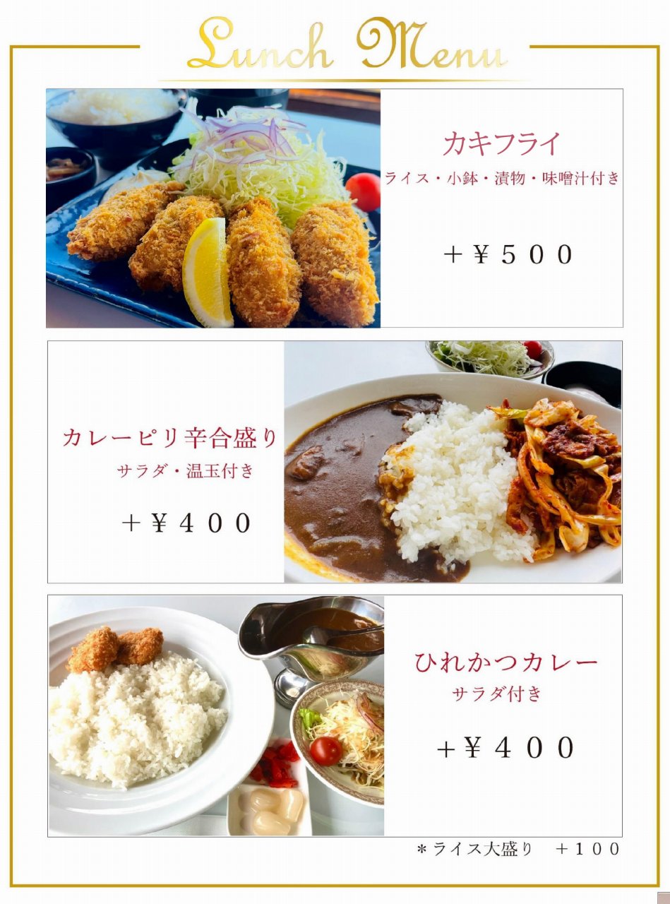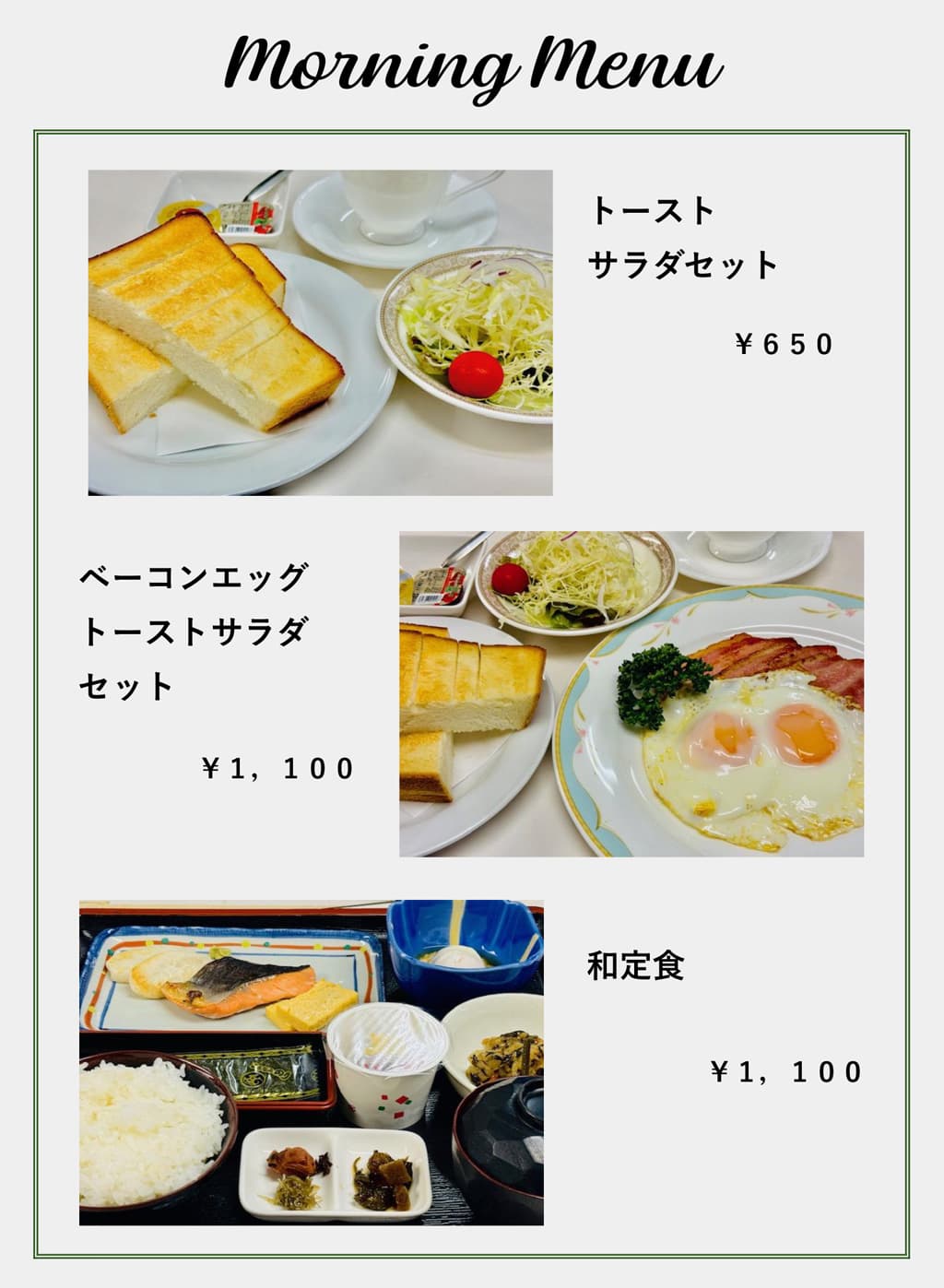 | ● 土日、祝日 | 朝食 7:00~9:00 (8:30 L.O.) 昼食 9:00~14:00 (13:30 L.O.) プレー後 14:00~17:00 |