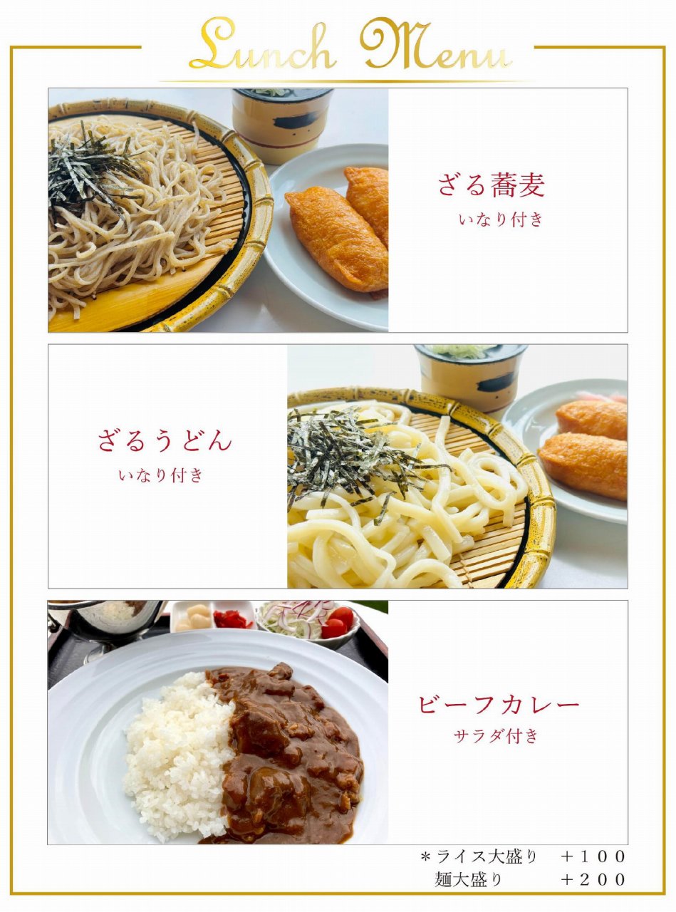| ● 平日 | 朝食 7:30~9:00 (8:30 L.O.) 昼食 9:00~14:00 (13:30 L.O.) プレー後 14:00~17:00 |